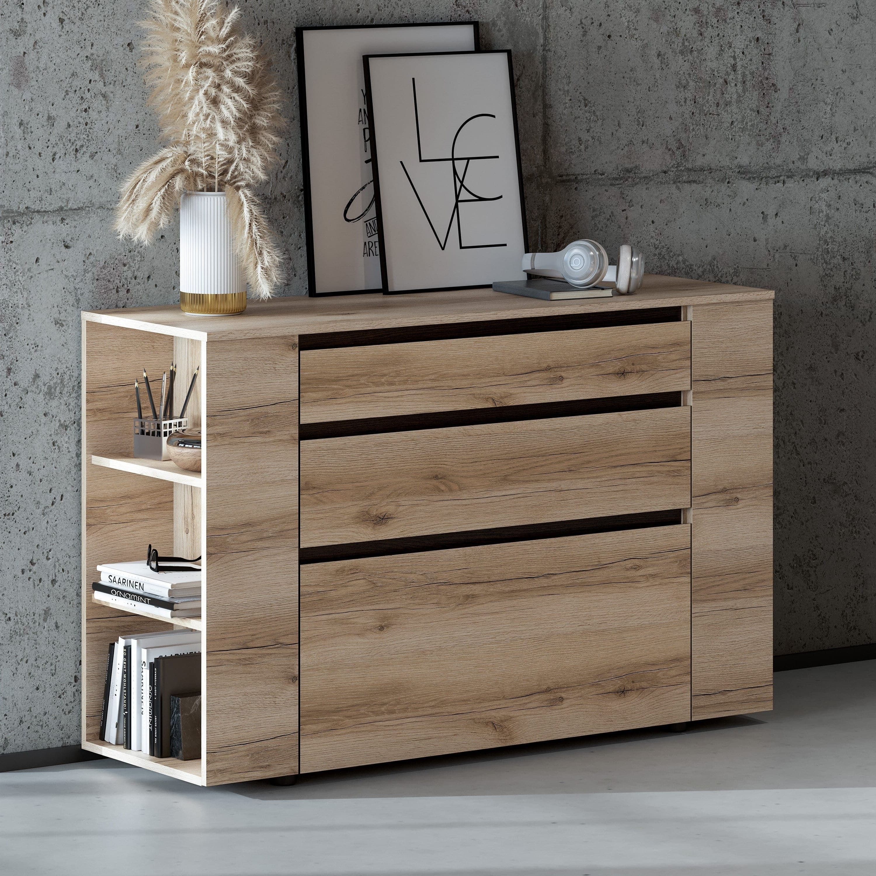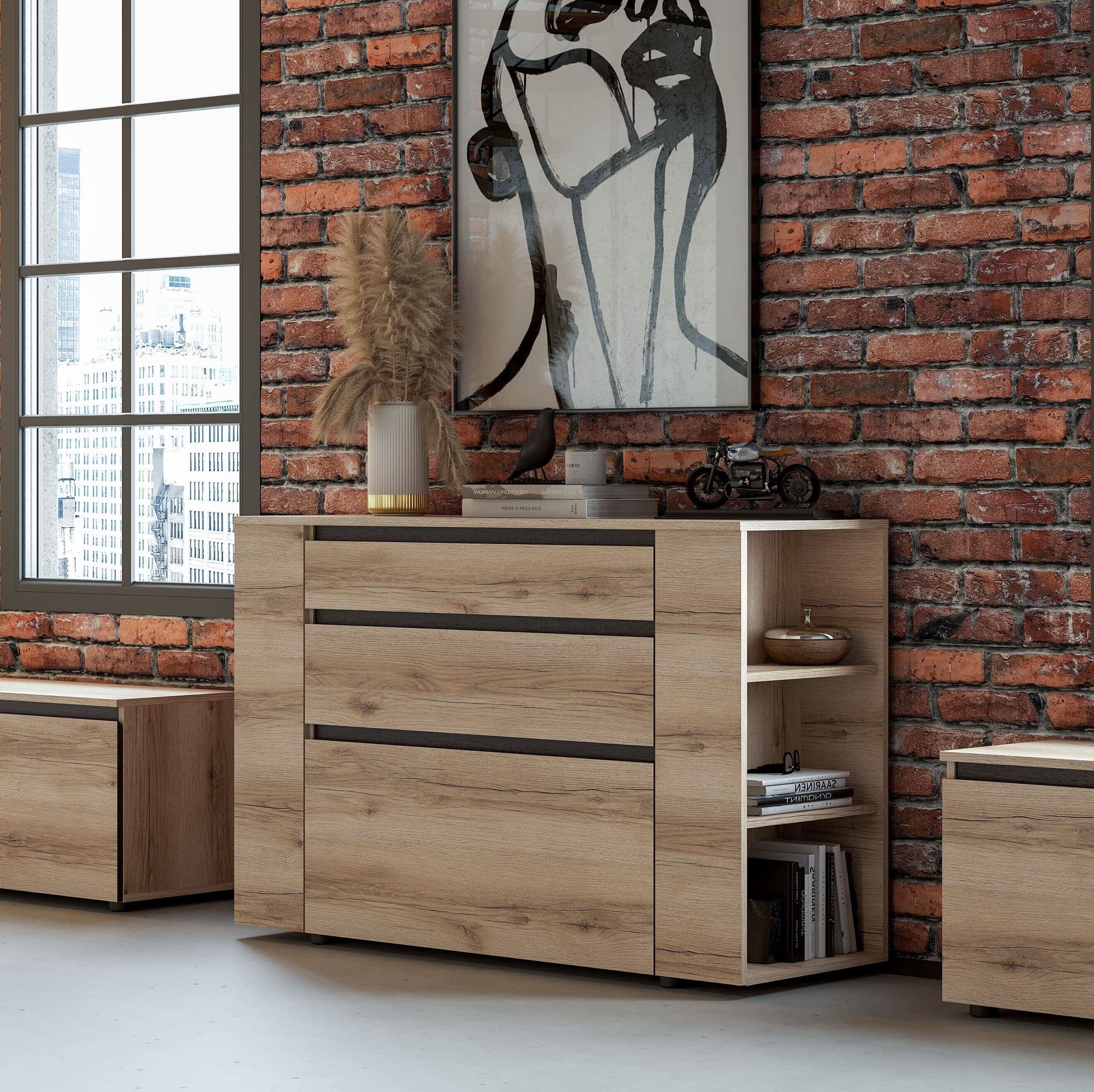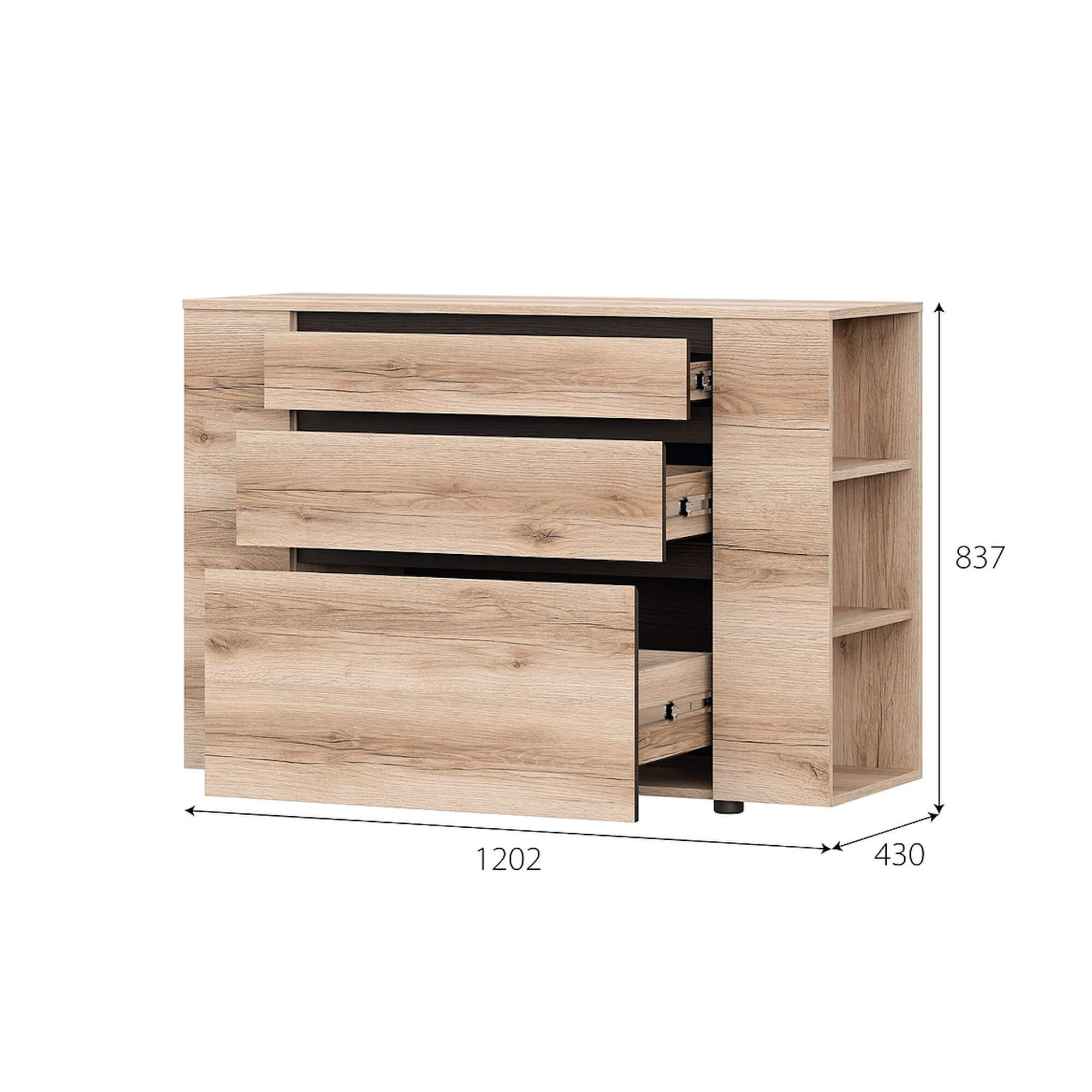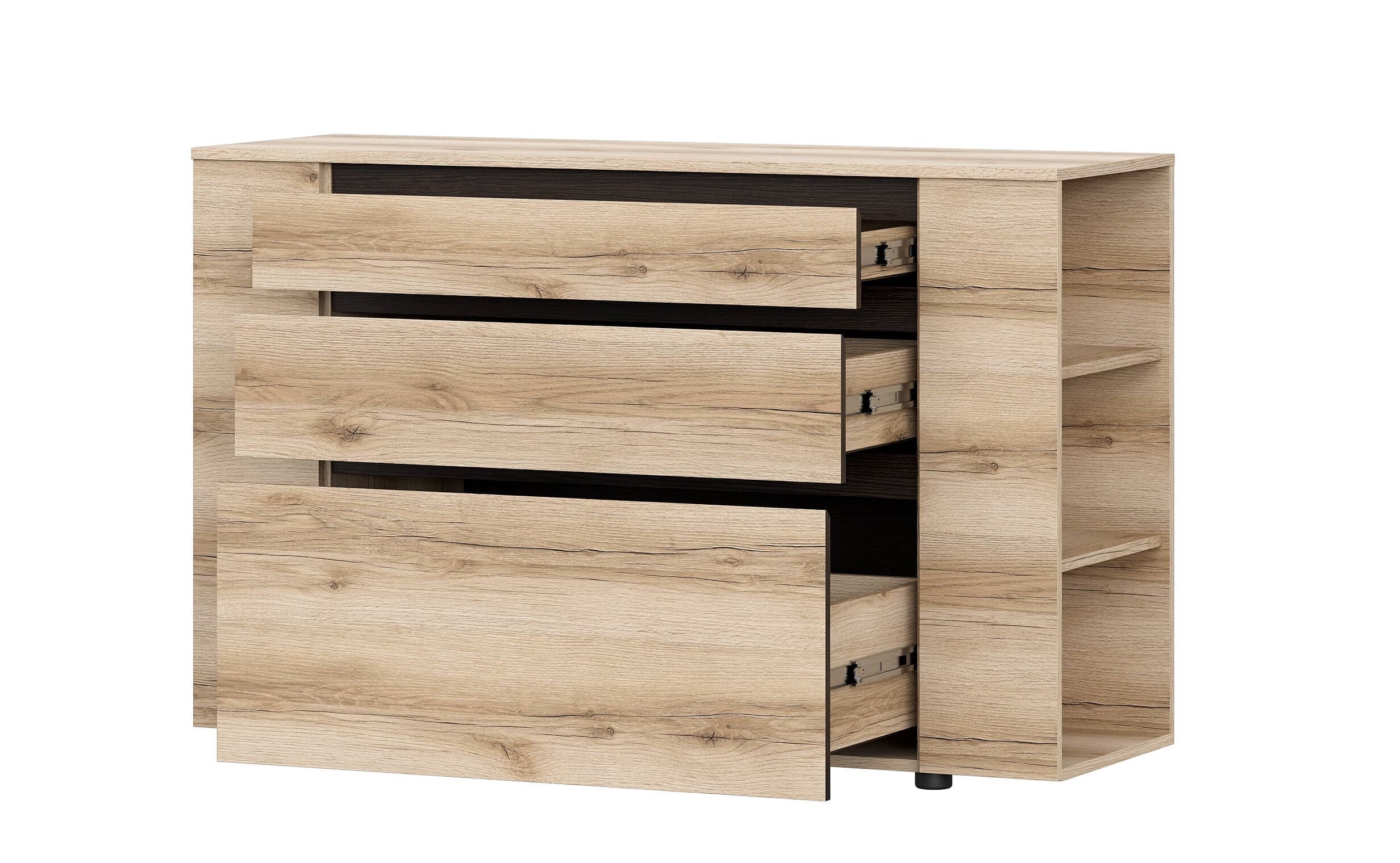 - Стиль и многофункциональность. Три выкатных ящика на высокопрочных шариковых направляющих, отличающихся высотой, обеспечивают удобное хранение вещей разных габаритов.
